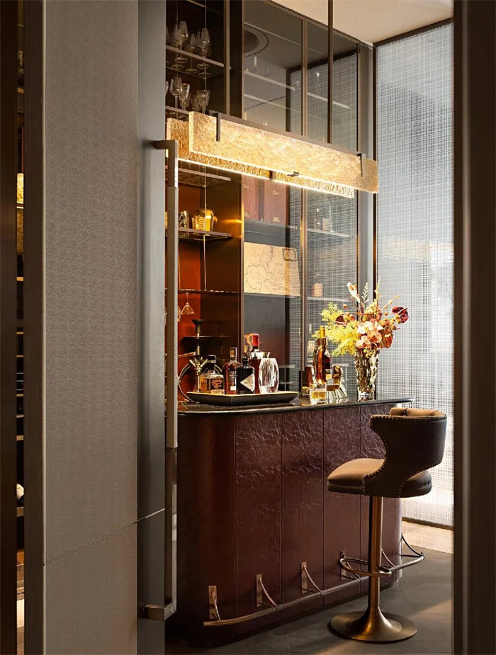 从远至近,空间犹如城市生活的画卷缓缓展开,水晶吊灯点亮了空间的灵动性,在光线的作用下,却给人一种隽永之感,奢华之下是让人无限遐想,汇聚品酒、聚会、宴请、商务等多种生活场景,这里不仅是城市喧嚣中的一处静谧休憩地,更是精英们社交聚会的理想场所,任其尽情享受都会生活的千般风情。奢华且神秘的空间基调,暗藏着文人雅士闲聚的痕迹,书籍与摆件、雕塑等艺术品融合摆放,呈现出包容开放的生命状态。天时地利人和营造的静谧体验,与极具华丽代表的LALIQU以抽象线条与光线律动,为空间增添了一抹独特的艺术风采。