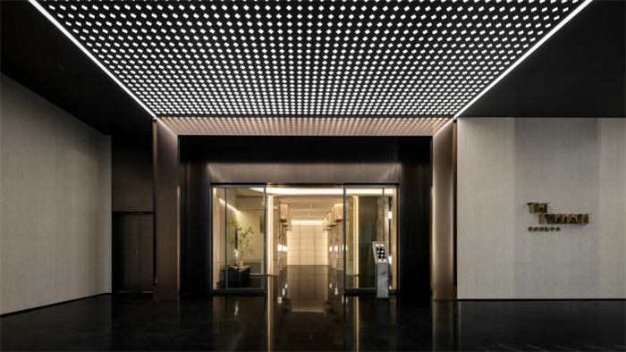 曲线弧度突出电梯间的艺术感,每根柱子与剧院式花苞形顶灯的巧妙融合,让人在每一次升降之间,都能感受到如诗如画的仪式感,仿佛正被送往另一个时空的艺术盛会。灯光照片系统精准的营造每一寸空间的情绪氛围,天花板密集排列着的小方块灯组,它们如同繁星点点般散落在黑暗中,为整个通道带来了明亮而柔和的照明效果。通往车库的动态线条,引导视觉流动,强化了空间的纵深感与导向性。
