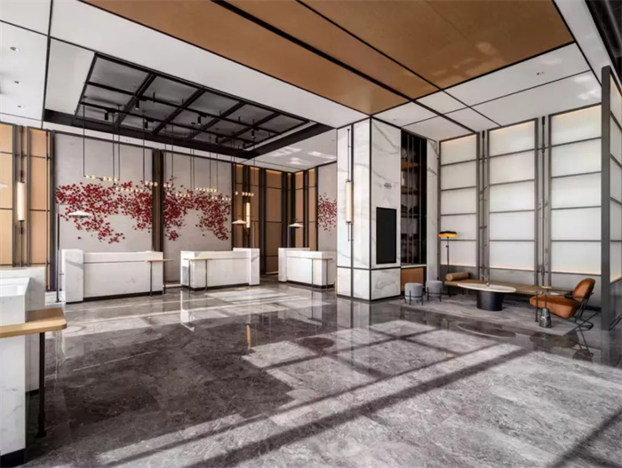 太原悠久的历史文脉成为贯穿酒店的线索,大堂里宛若游龙的弧形长凳,点出太原的别称“龙城”。冷灰色大理石、暖色调金属以及矿石状的吊灯,突显出矿产大省引以为傲的丰厚资源。