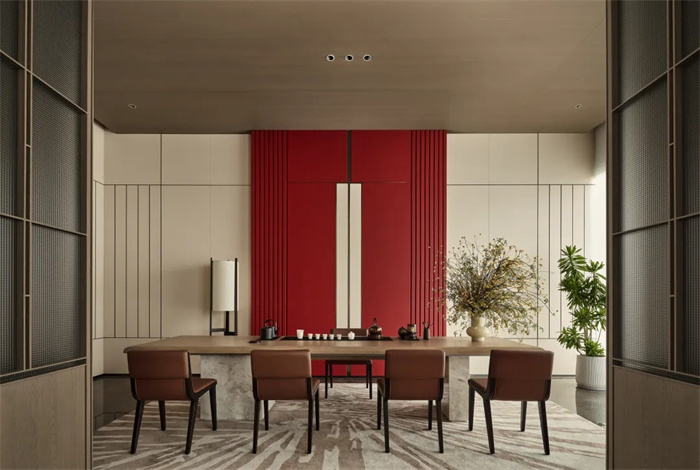 宴会厅和茶室经由推拉门隔断,互不打扰,彼此共生。茶室用中国红作为空间的基础色调,无需冗杂的装饰,便足以展现空间的雅致。