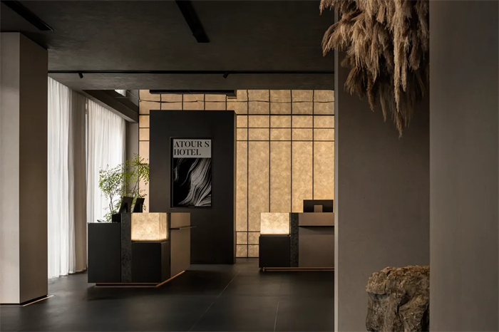 受制于物业条件的限制,酒店大堂的层高只有3米多一点,我们索性将天花和地面全做成深色,将空间分割成若干个几何形体块,大面积的发光灯箱和镜面的使用,将空间呈现出错落有致,步移景换的游园体验,空间相互穿插、交错、相融、明暗、深浅、软硬结合。此处我们将镜面置于顶部,采用竖向的线条将原本不高的天花拉升,灯光相连,深色悬浮,打破了空间的界限,原本低矮的大堂瞬间有了精神向上生长。