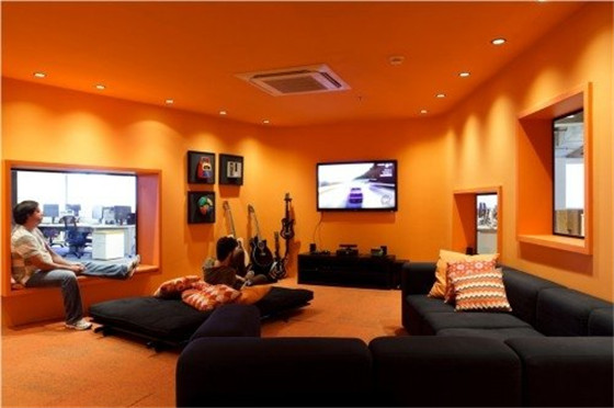 各个部门分布在不同的楼层,为了便于员工和访客的确定区域,设计师每层的在中心地带设计一个独特的识别空间,打破空间垂直方向上的呆板。作为重要的空间组成,每层都有休息室和减压空间。设计师希望通过这些休闲区域,增加不同员工部门的互动交流,为他们增加思维活力。为了确保空间的连贯,休闲空间都有相似的设计语言,并分别选择了沃尔玛的官方色黄色、绿色、蓝色、橙色、作为每层的主打颜色。