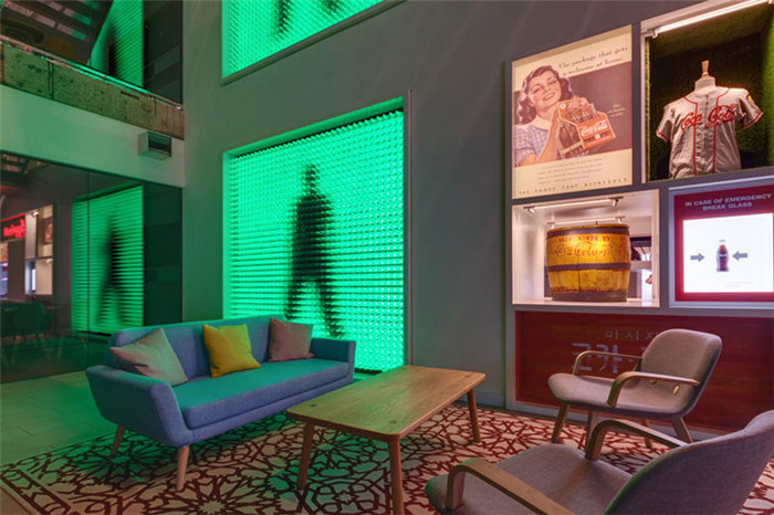 设计师还应用招贴画、告示牌、logo和包装在内的相关的艺术元素装饰整个办公空间。例如:由35000根吸管制作的嘴唇装置;由5000个可口可乐瓶体制成的“饮料瓶墙”;还有从二楼垂下的由30,000枚亚克力组成彗星般LED灯具。个性有活力的装饰设计为整个空间展现了不同的视觉效果。