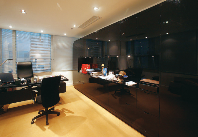 上海酒店投资公司,是一家多机构的公司,我们设计了一个长形的黑色烤漆的木柜沿着墙壁延伸出去,墙体则是浅棕色木板装饰。会议室和所有的办公室都有着垂直的、半透明线条装饰的玻璃墙。