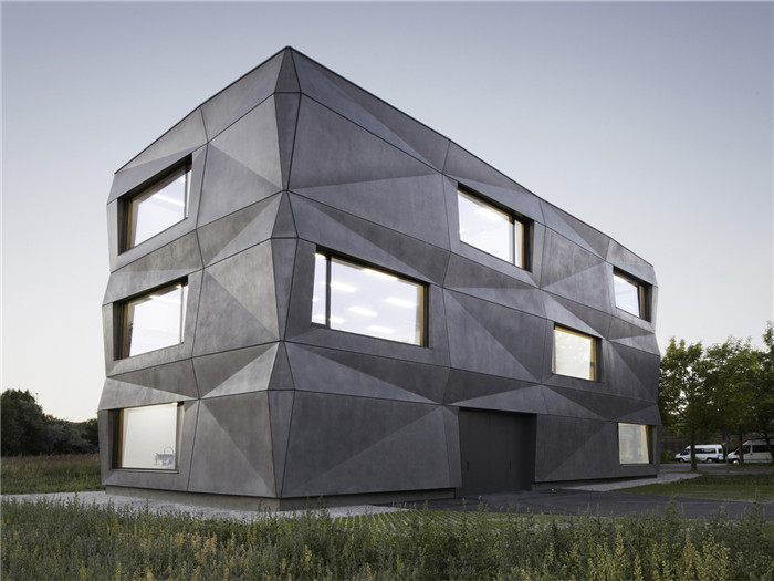 Textilmacher办公楼的独有的特征是其几何叠外观状设计,简单而不失独特,建筑外观交汇着光与影,也别具一番风味。为与外部环境相互融合,设计师在外观设计上采用了浅色混凝土。办公楼的混凝土墙一共有四个不同的板块,模板与模板之间互相镶嵌着,形成一种完美的维护结构。