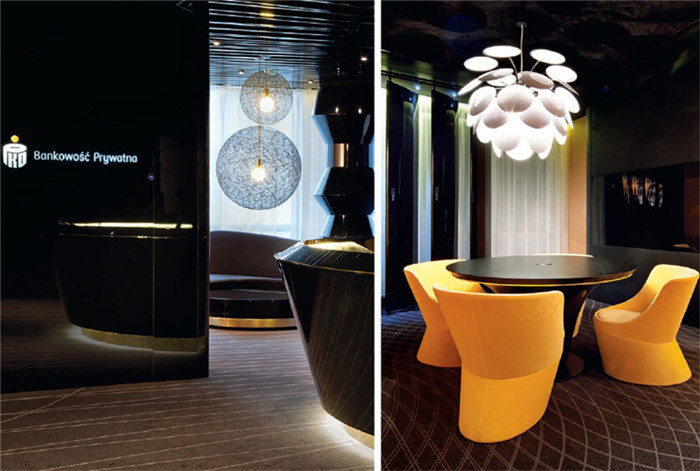 文章导读:本案是白猫工作室为树立银行的企业形象而设计的,私人银行部采用黑、白、金三色作为室内装饰的基本色调,并配以色彩典雅、极具现代感的波兰银行Logo。会所其他平面设计元素也同样独具匠心,装饰主题融入了优雅的网格和曲线.PKO波兰银行的私人银行部也采用了这样的设计风格。