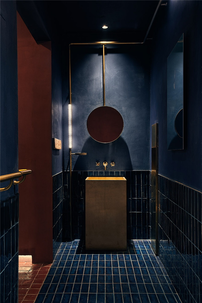 由于位置的局限,到达洗手间要通过一条狭长的走廊,而我们试图将这条本来是劣势的通道设计得有趣。掀开蓝丝绒窗帘,一个中古的重潜头盔映入眼帘,它被改造成一个壁灯,幽默地提示着洗手间的入口。