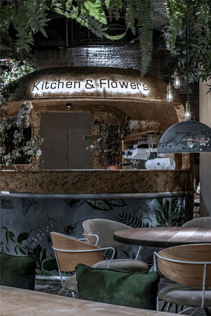 把绿植物和鲜花比做幸福,还有温柔与坚定,安详与爱情的思绪,让情愫一点点误入奇境的梦幻感,顶面钢网建筑的构造,通过光与钢网建筑的对话,从而这矛盾的两极在空间交融为一体,成就了光影迷离的神秘花厨。Comparing the green plants and flowers to happiness, there is also the soft and firm, peaceful and love thoughts, the dreamlike feeling of letting the feelings slip into the Wonderland a little bit, the structure of the top steel mesh building, through the dialogue between the light and the steel mesh building, so that the two poles of the contradiction blend into one in the space, achieving the mysterious flower kitchen with blurred light and shadow.