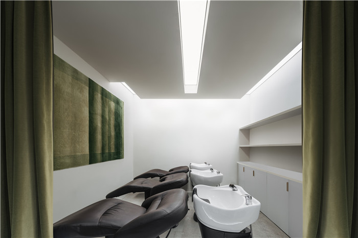 剪发区域的镜台使用一体化的手法,在一整面墙延伸。避免在满客的情况下,不同造型师的个人工作区域的重叠使用。冲洗区沿用了自然透气感的元素,空间的单一色调难免略显无趣,冲洗区使用了绿色点缀,作为空间色调中的一个跳跃,环境整体的氛围没有被打破,反而更显可爱与惬意。