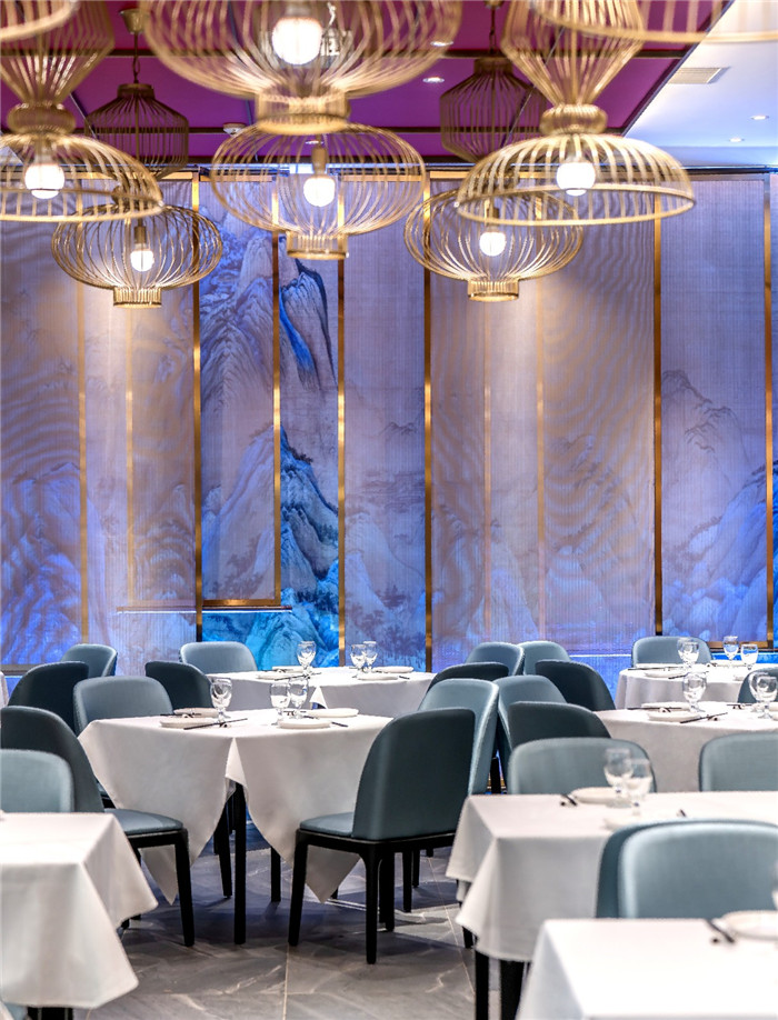 淬炼古人精致生活意境,一案一几,一花一木,一山一水……,运用当代摄影艺术手法,赋予不同材质的呈现。选取千里江山图做为宴会主墙画面,细致入微,烟波浩渺的江河、层峦起伏的群山构成一幅绝美的山水图画,搭配层次分明、富于变化的铜帘画卷装饰,游走于空间之中,隽永清秀,极具古今风韵。