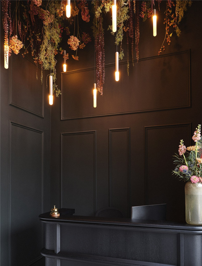 为了能够同时吸引追求高端设计的现代旅行者,以及庄园周围较为传统的现有客人,酒店设计团队试图通过一种新颖的方式去诠释经典的狩猎和自然元素。在休闲室,传统的动物标本与荷兰设计二人组Les Deux Garçons创作的艺术品被结合起来,形成某种“异常”却又幽默的独特感觉:墙面装置展示了喜鹊对闪亮事物的迷恋;Arden餐厅里,一对海狸正在肆意地享用着古玩柜的美味木头。餐厅内提供的菜品部分来自城堡的温室和菜园。城堡庭院的下方还设有一个圆形的酒窖,存储着大量葡萄酒,与Kwinten Boelen掌管的厨房菜肴形成和谐的搭配。