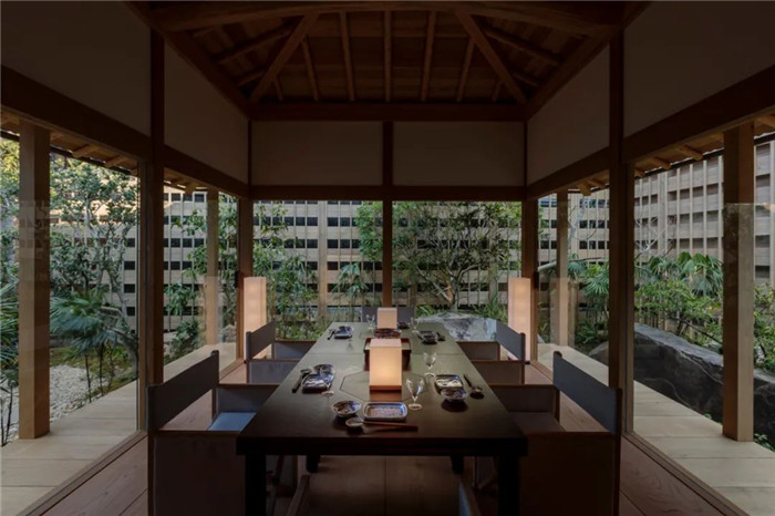 酒店客房里同样也弥漫着这种宁静氛围,与白色的yukimi shoji屏风、当地工匠Doi Mokkou制作的木制家具和方形木浴缸相辅相成。