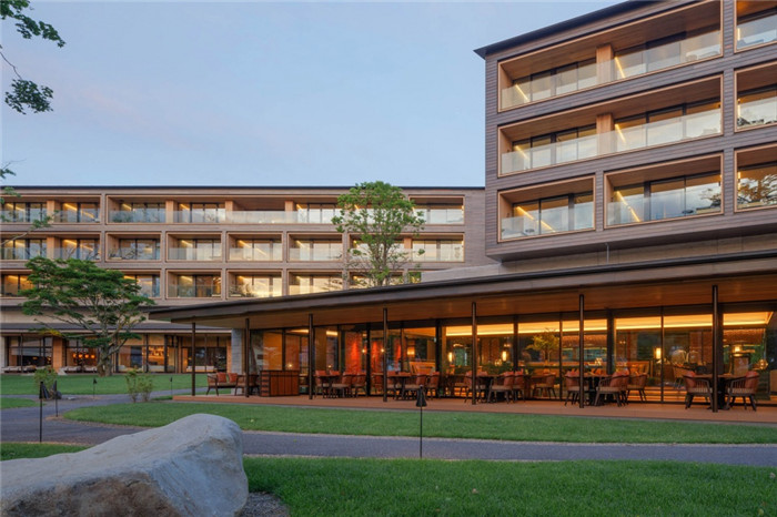 首先,酒店设计团队面向三大美景(中禅寺湖、白根山、男体山)配置了三栋客房楼,尝试将建筑融合于周围环境之中。男体山作为山岳信仰的圣地,长久以来是只允许僧侣进入的修行之地。地块内几棵近20m高的日本冷杉,可以说是该处历史的见证者。