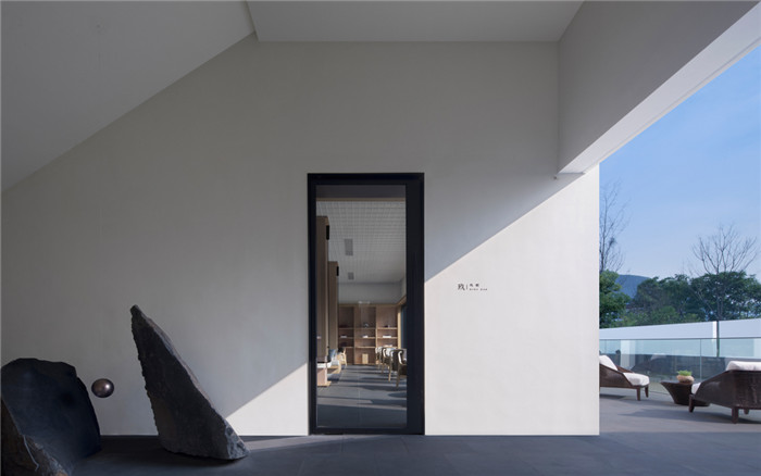 酒店入口置入风雨游廊,轻盈钢构营构出仪式感,墙和顶仅是围合,一障一引,指明邀约的去向,庭中桂树风随影动,珊珊可爱。“有之以为利,无之以为用”:围墙是“有”,是手段,空间是“用”,是目的,半透的砌块墙处于虚实相生的中间态表达着呼吸感。岩石板勾勒出池水的边界,碧波荡漾,水托起房子,松林退成景布,构成了层次丰富的悠然意境。