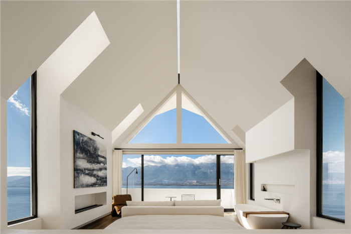 为了尽可能地凸显自然之美,设计师采用了非常质朴的设计手法。建筑外部从大理白族民居的建筑风格中汲取灵感,将白色立面和灰色屋面巧妙糅合,保持建筑整体利落简洁的几何感,佐以柔和的曲线元素,不炫技,却又不失饶有趣味的韵律感。