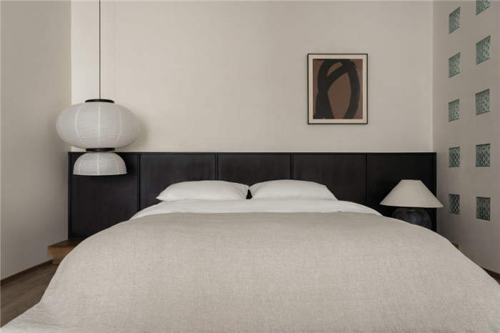 空岛・半山的客房内部,整体采用了低饱和的色调,给人沉稳静谧之感。房间内的选品,设计师也颇费了一番心思:从木材到石材,从铁艺到瓷器,从羊毛到亚麻布,力图将天然材料与当地美学,以可持续设计的理念融合在一起,呈现出一种返璞归真的自然之美。