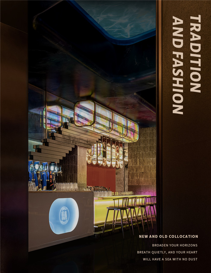 一进入空间,人的眼光便被吸引,空间的张力与城市的魅力似乎由此为轴心逶迤展开。四川盛产竹,在成都茶馆喝茶总能寻得人与天地草木相和的自然之境。空间悬挂的艺术灯具设计灵感取自於竹节,引人沉浸在品茗与草木好景营造的空间之中,体味与天地人和之乐。