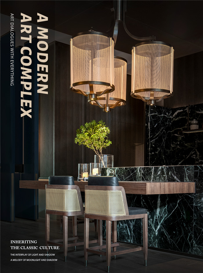 以洛阳“洛水传说”为灵感的艺术品和灯具,将民族文化与现代艺术融合,对话洛阳盛时的繁美。简洁的栏栅屏营造东方意境氛围,对比今古,感受温文尔雅的悠远。深蓝的跳色为空间增加灵动的情趣,视觉变化之中形成沉稳包容前卫的和谐感。