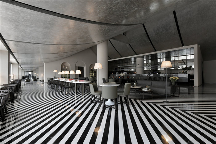 独具设计巧思的大理石黑白拼纹满铺地面,灵感源于宋画的水墨意境,以简洁利落的素描线条模拟江波微浪、一望无垠的美学意境。古铜色的卵石雕塑错落有致,犹如江中浅礁,充满意趣。传统意境和现代风格的独特搭配兼具古典韵味与潮流气质,为空间营造充满魅力的对称性和平衡感,在东西结合的优雅气质间,写就跨越时间、空间的咏叹调。