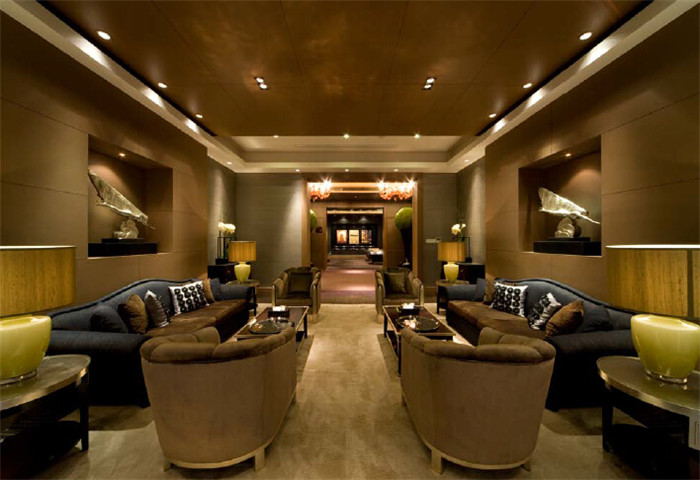整个销售空间以咖啡色为基底,大量的大理石、金属和镜面硬性材质与壁纸、皮革、地毯等软性材质的有机结合,配上几何图形与具有装饰性的家具、饰品的完美点缀,使得整个空间在实用的基础上更富装饰性,同时也完美演绎了Art-Deco现代传统又不失摩登时尚的独特魅力。