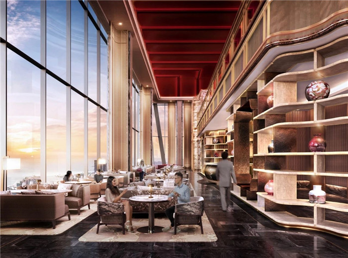 乘坐考究的材质与真丝刺绣点缀的“轿子”抵达空中大堂,映入眼帘的便是庄重之间生机盎然的中式建筑。轿厢设计采用了暗红色的真丝刺绣瘿木等细节点缀,弘扬中式工匠精神。