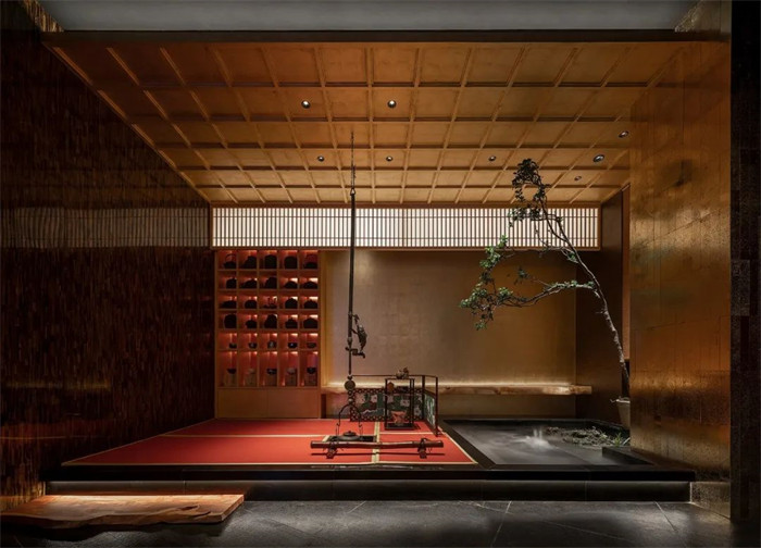 空间中体块散落,景致蜿蜒,多变的视觉纬度疏密有致地呈现了视觉的高级感,形成别样的日式禅境。历经时光打磨的日本欄間,也在新生的空间中找到了恰当的存在方式。这是另一种形式的可再生资源的实践应用。而花岗岩毛石、九龙玉以及其他自然石材的加入,也让过去对话未来成为现实。五亿年前的化石作为空间中时光痕迹最重的存在,传递出作品在空间中对于时间的致敬。玛瑙玉石的入驻,为素雅的空间增添了一抹清亮的蓝。