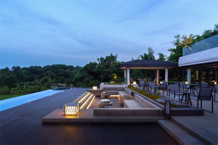 在户外,度假酒店最重要的是客人和自然在做对话,以自然提供的空气、阳光、植物的融入,让人感受到自然的介入。所以项目特别设置了茶亭,能让客人在有微风细雨的天气,在空气流动、飘满花香的空间中品茗、交流,同时设置了就餐平台。夜晚时,客人可以走出房间,在谈心坑中围绕着火炉喝酒谈心。天目湖微风轻拂,夜色阑珊。