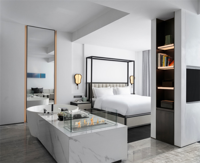 房间尺度奢侈,功能齐全,空间传递着安静的力量。每个房间基本都配有茶区、休闲区、卧区和洗漱区。在这里,希望客人能忘却时间带来的焦虑,舒缓工作带来的压力,忘却生活带来的烦恼。希望馥峪度假酒店具有精神疗愈的作用,这也是酒店设计团队为城市倦鸟设立的再次蓄能空间的初衷。
