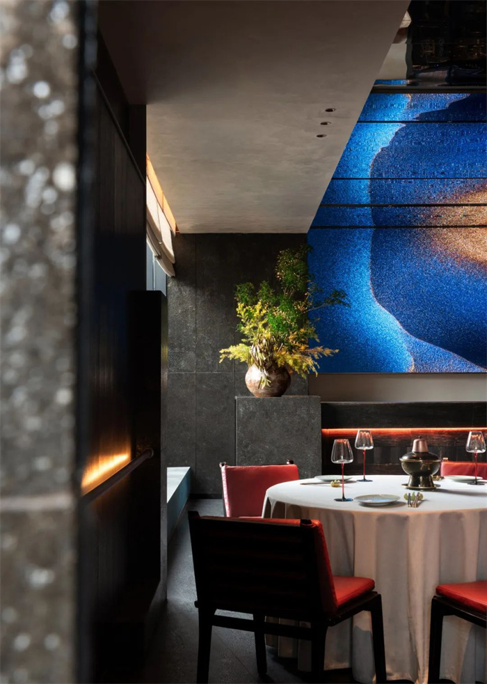 扶梯一侧使用传统天青色,山石、画屏、透光石做角落点缀,传统意向成为当代空间偶尔的驻足和回望。对比重力度的把控也是设计在诠释当代空间时的重要考量。在三层正式散客区域,宋式美学宏大的底色一点点凝练成京π火锅现在的空间形象,属于宋的符号隐去。