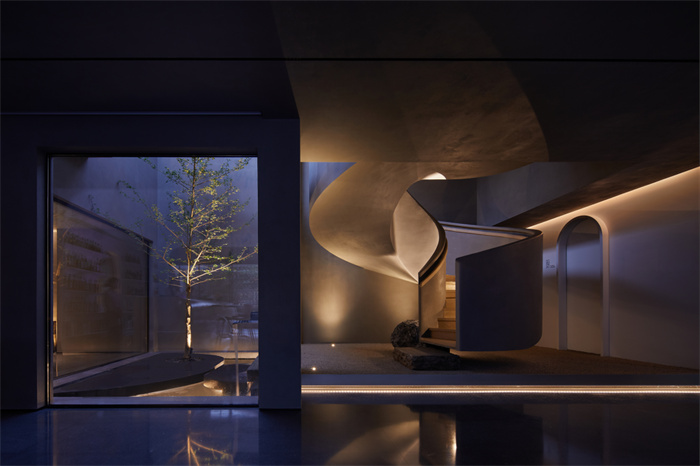 饮茶作为现代化生活方式之一,品茶交流,茶空间拉近了与人的距离。一张长条茶桌延伸至室外,与自然形成共生,通透的落地玻璃将室外景色引入室内,颇有古人月下会饮的场景,为空间添加了诗意。