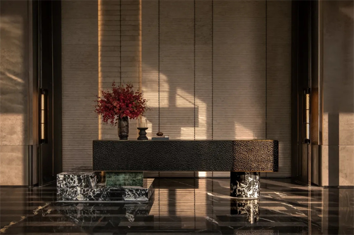 步入前厅,光影点缀得恰到好处,翡翠奢石色泽馥丽,细腻的纹路蔓延氤氲,浓淡结合,在简洁的线条之中丰富了空间的层次与视觉感受。艺术的调性,古今融合的气质,成为最初的意向词,以东方礼序重塑空间的原始结构,浮光温婉,描绘典雅尊贵的入户厅堂。