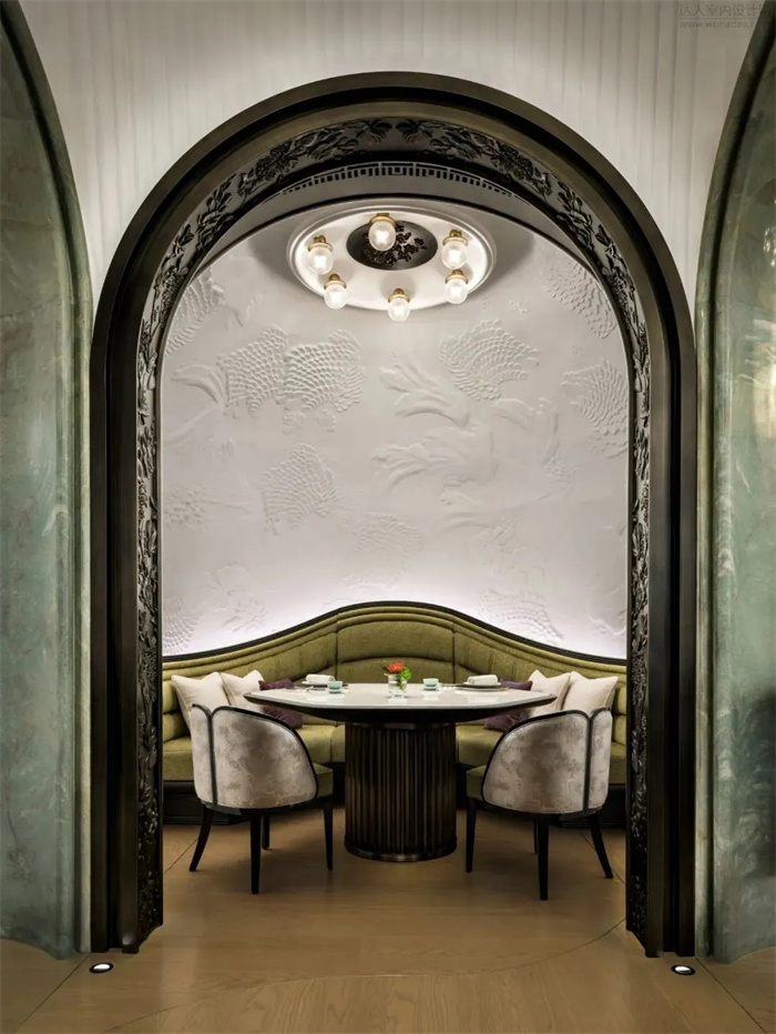 西湖之美,融入餐厅的每个细节。天花和墙面装饰的波纹,恰似西湖涟漪轻轻荡漾,空间也更显柔和。而祖母绿石材铺陈的用餐区,则让人联想起苏堤春晓的盎然绿意,杨柳依依,生机勃勃。