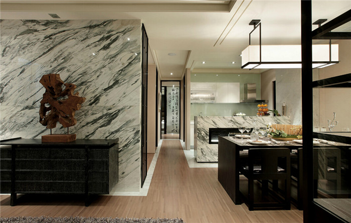 销售空间布局大气开扬,走道高阔气派,在这样简洁、敞朗的环境,设计师特别注重材质的搭配与对比。比如洽谈区的演示墙身,以石材、不锈钢片、皮革一层层装饰,在淡雅的色彩环境下,仍然显得层次丰富.质感十足。