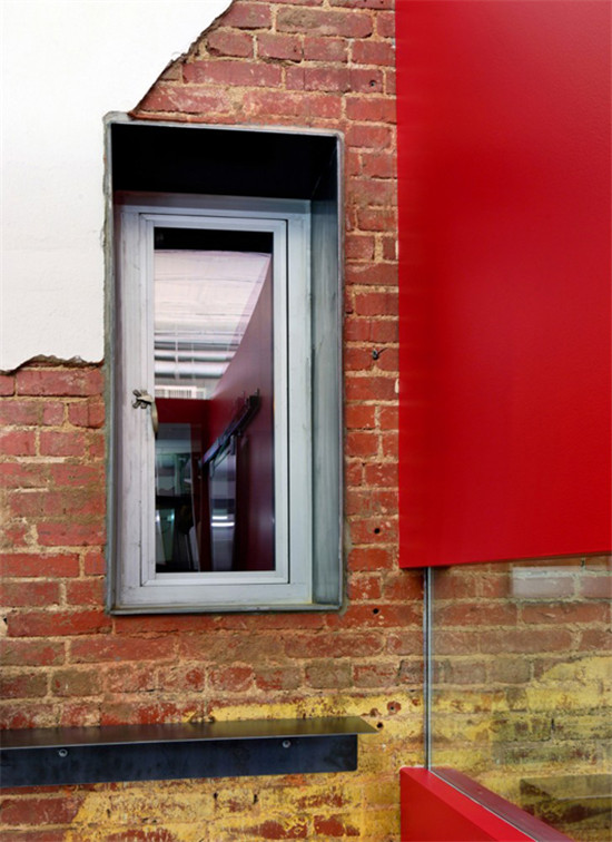 设计师奇思妙想将北立面的铝合金遮阳篷反转90度变为建筑窗扉,既可以通风又可以为室内引进自然光。预算金额的限制也激发了“包装折叠”的灵感思路。高效日光灯安装在这个“折叠”装置上部,通过顶面反射间接的照亮室内,位于室内一侧的墙上壁灯既是工作照明又辅助室内总体照明,这样使空间形态丰富起来。