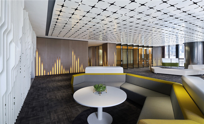 区别于“格子间工厂”的时代,我们需要更灵活及人性化的多元化办公模式。路演区被设计成一个开放式的空间,通过坐具多样化的组合模式实现多功能的室内项目,顶面采用十字形镂空铝板加强装饰性与美观性,大面的玻璃幕墙赋予这片区域更好的采光与更开阔的视野。