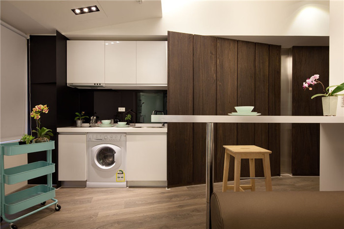 入门一进,深色雕刻木皮的柜体跃然出现,而彷彿山峦般的起伏曲线削弱了量体给予的沉重,使空间软性的随人起伏呼吸。人造大理石厨房流理台柜体清净与洁白并在下方嵌入了滚筒式洗衣机,一旁配置了锻造黑铁柜低调调和空间中的木作自然氛围,敏锐精准拿捏了别墅家居的机能需求。